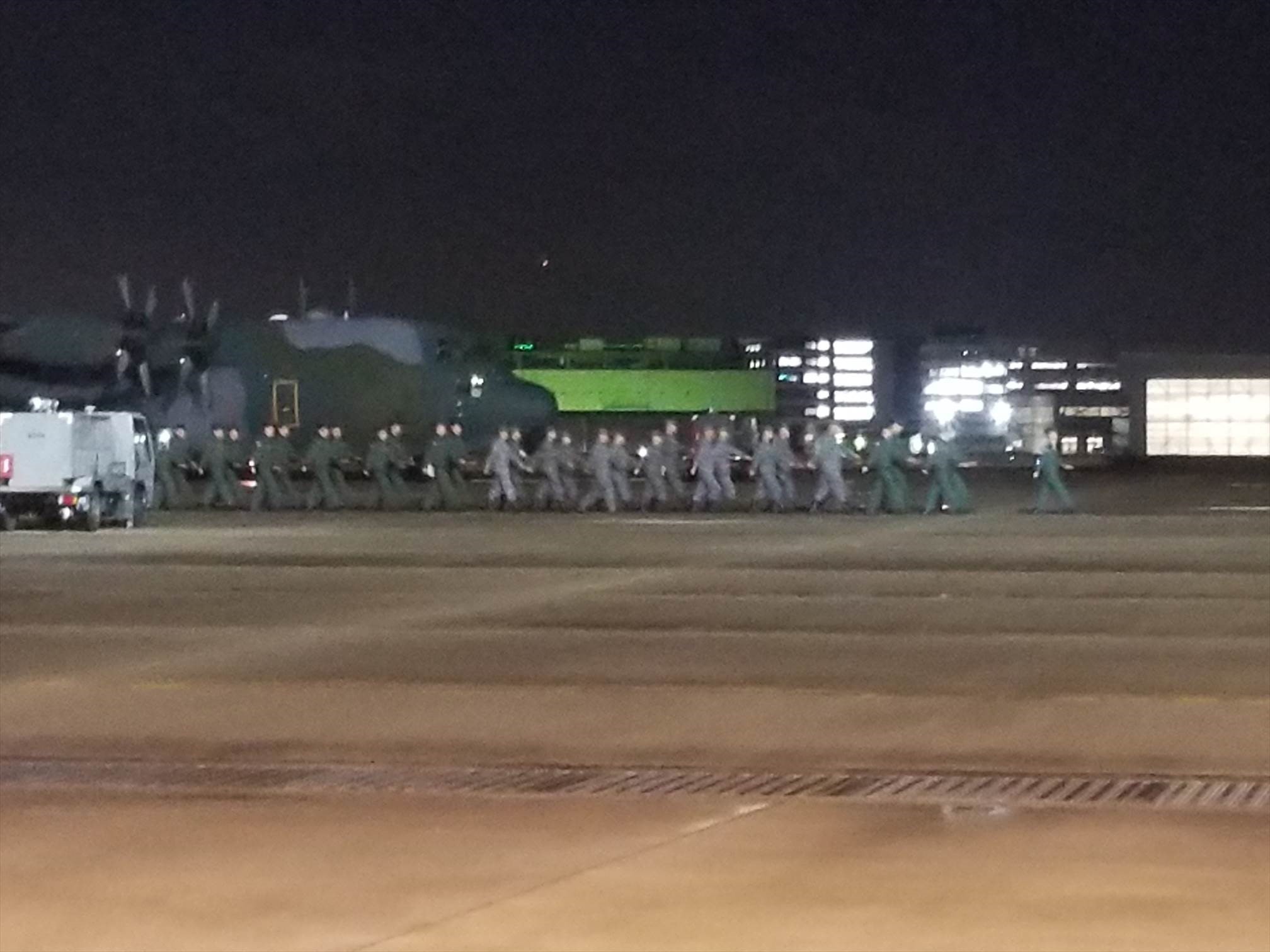 帰国後、千歳基地隊員から歓迎を受ける空輸隊の隊員(統幕SNS