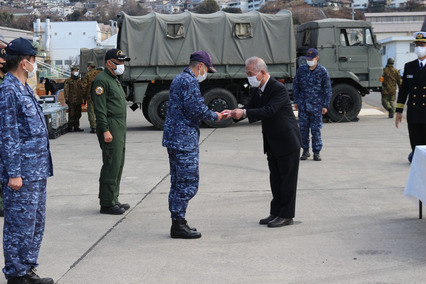 「おおすみ」出発に先立つ1月22日、広島県隊友会(会長・寺尾憲治)は、物資搭載作業の現場を訪れ、隊友会からの激励品とともに広島県隊友会及び呉支部からの独自の激励品を贈呈した。