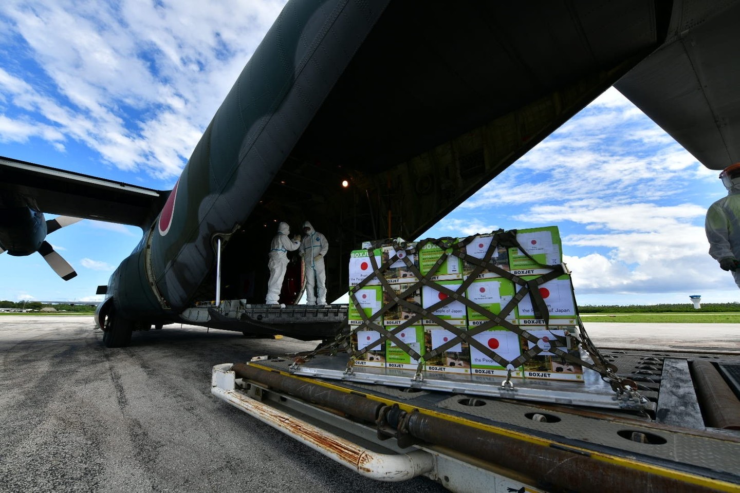 C-130輸送機から緊急支援物資を卸下(統幕SNS)