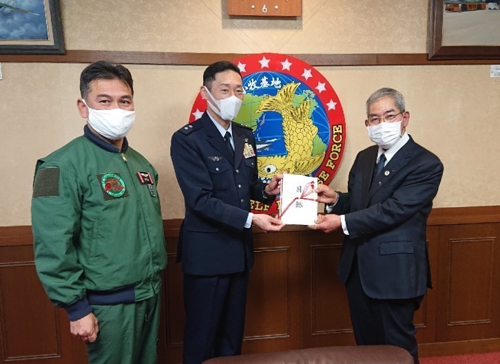 帰国前の16日、千歳地方隊友会(会長・菊地伯)の寺澤博・副会長及び斗賀山信美・事務局長は隊本部を訪問し、特別輸送航空隊司令・山田眞也1空佐に隊友会からの激励品を贈呈した。隊司令からは「真っ先に激励くださり有難うございました」とのお礼の言葉があった。