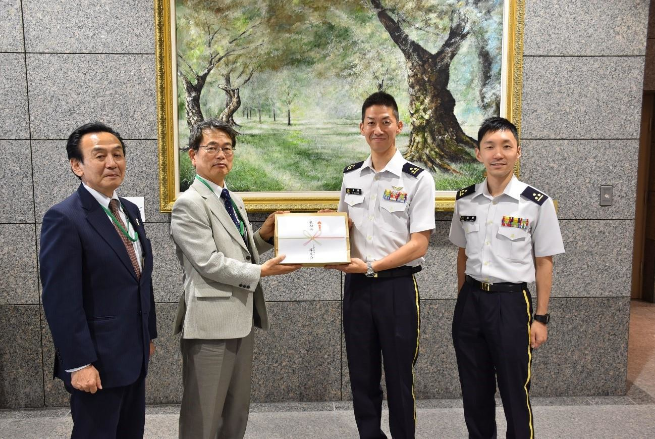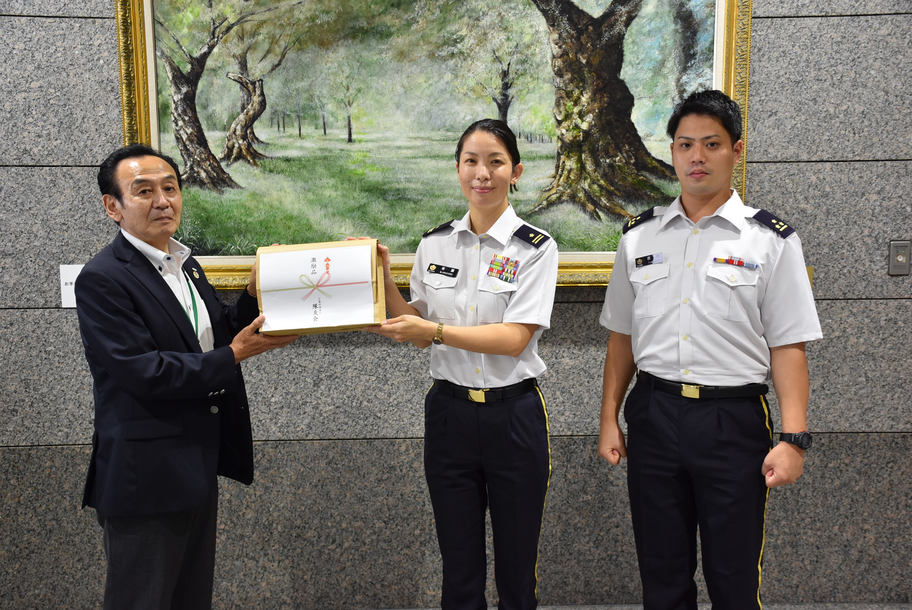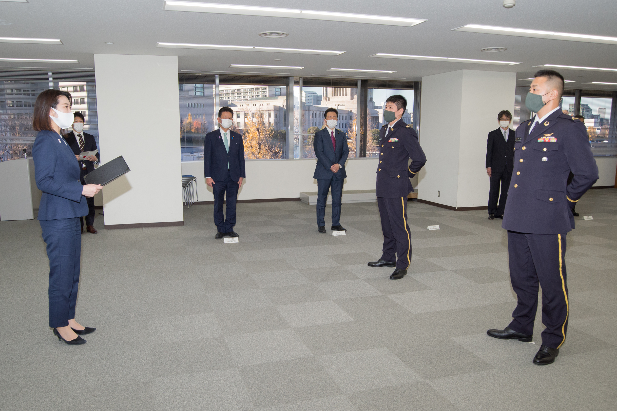平成30年12月19日(水曜日)、国連南スーダン共和国ミッション司令部要員の陸上自衛官2名(3等陸佐宮本綾子・兵站幕僚、1等陸尉中島大貴・航空幕僚:陸上総隊司令部所属)に植木事務局長より激励品を手交した。
