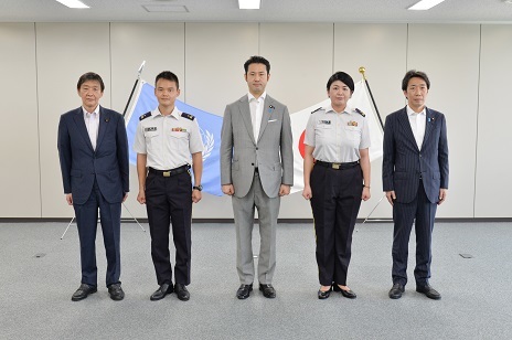 令和2年8月5日(水曜日)、大塚拓内閣府副大臣、渡辺孝一防衛大臣政務官及び中山展宏外務大臣政務官の出席の下、国連南スーダン共和国ミッション(UNMISS)に国際平和協力隊第12次司令部要員として1年間派遣される2名の隊員(赤塚喜与3等陸佐(施設幕僚)、菅野美怜3等陸佐(情報幕僚))の出発式が内閣府にて行われた。