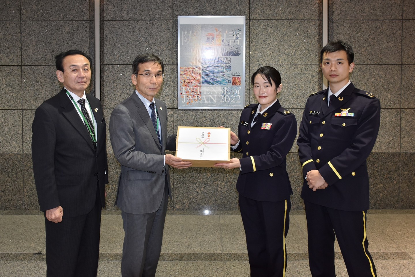 令和3年12月23日、国連南スーダン共和国ミッション(UNMISS)に国際平和協力隊第13次司令部要員として1年間派遣される2名(田原快1等陸尉=兵站幕僚、森克人1等陸尉=航空運用幕僚)に藤井事務局長から激励品を手交した。