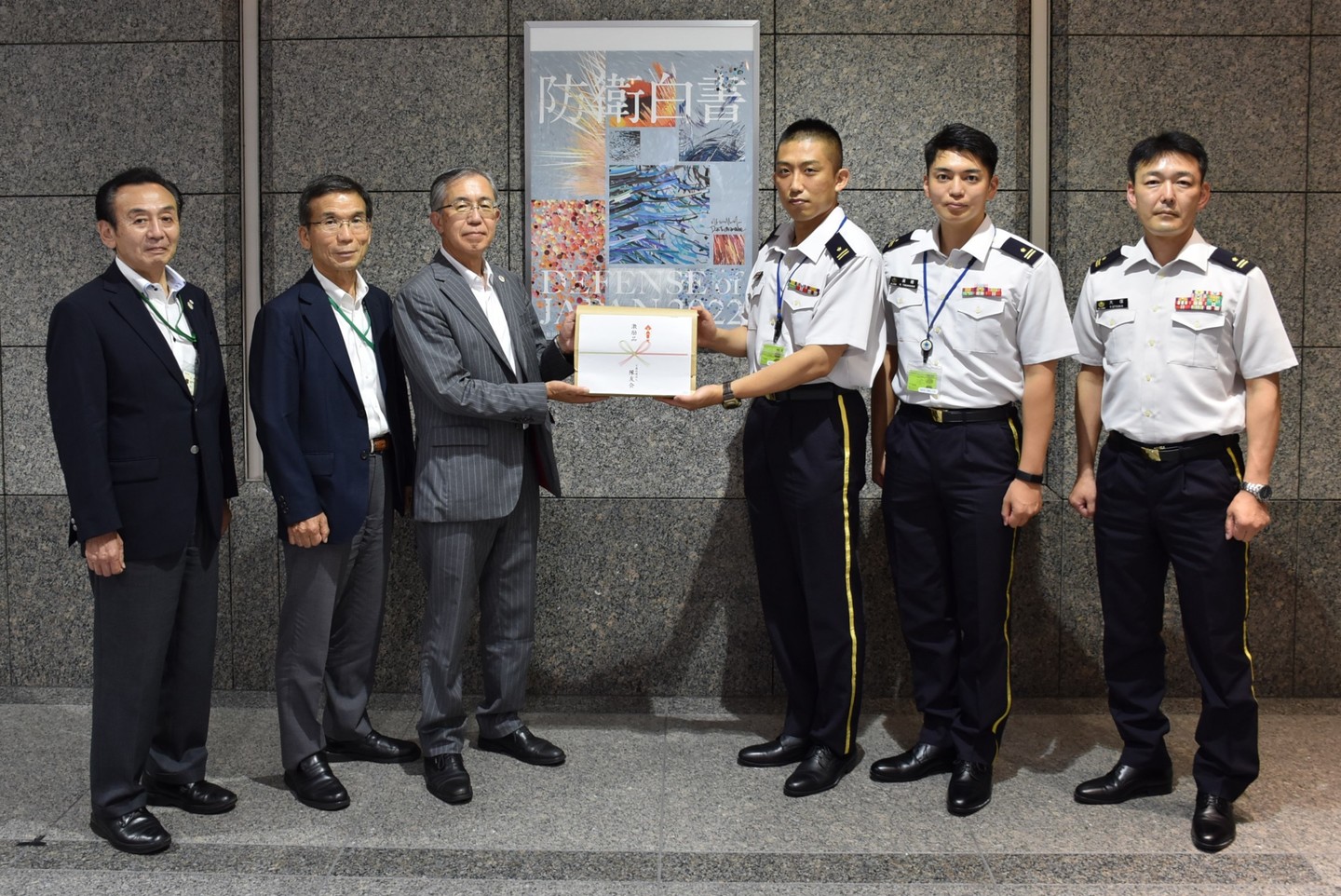 令和5年8月9日、防衛省(市ヶ谷)において、国連南スーダン共和国ミッション(UNMISS)に国際平和協力隊第15次司令部要員として1年間派遣される2名(永山高裕3等陸佐=情報幕僚、鶴野康寛3等陸佐=施設幕僚に、隊友会を代表して山本康正公益課長から激励品を手交した。