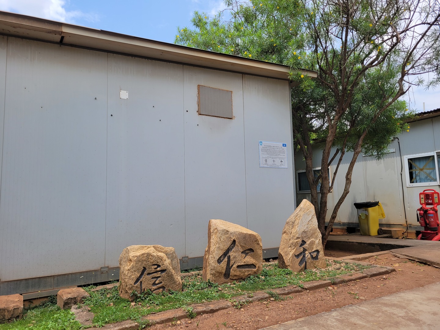 まず、UNMISSの施設課のオフィスエリアに足を踏み入れると、入口におかれた「信」「仁」「和」と書かれた3つの石碑が迎えてくれます。これは、UNMISSに対する日本の施設部隊の貢献に感謝を表するため、UNMISS高官が、当時の日本隊撤収後の宿営地に残されていた石を運ばせ整備したものです。現在、6カ国から陸軍工兵部隊が派遣されているのにもかかわらず、既に撤収した日本隊の石碑がオフィスエリアの玄関に置かれているわけです。一緒に勤務した同僚は口を揃えて、日本隊の高い作業規律や品質管理、そして現地住民からクレームが一切入らない仕事ぶりは、他国の工兵部隊の良い手本であり、レジェンドだ!と誇らしげに教えてくれました。