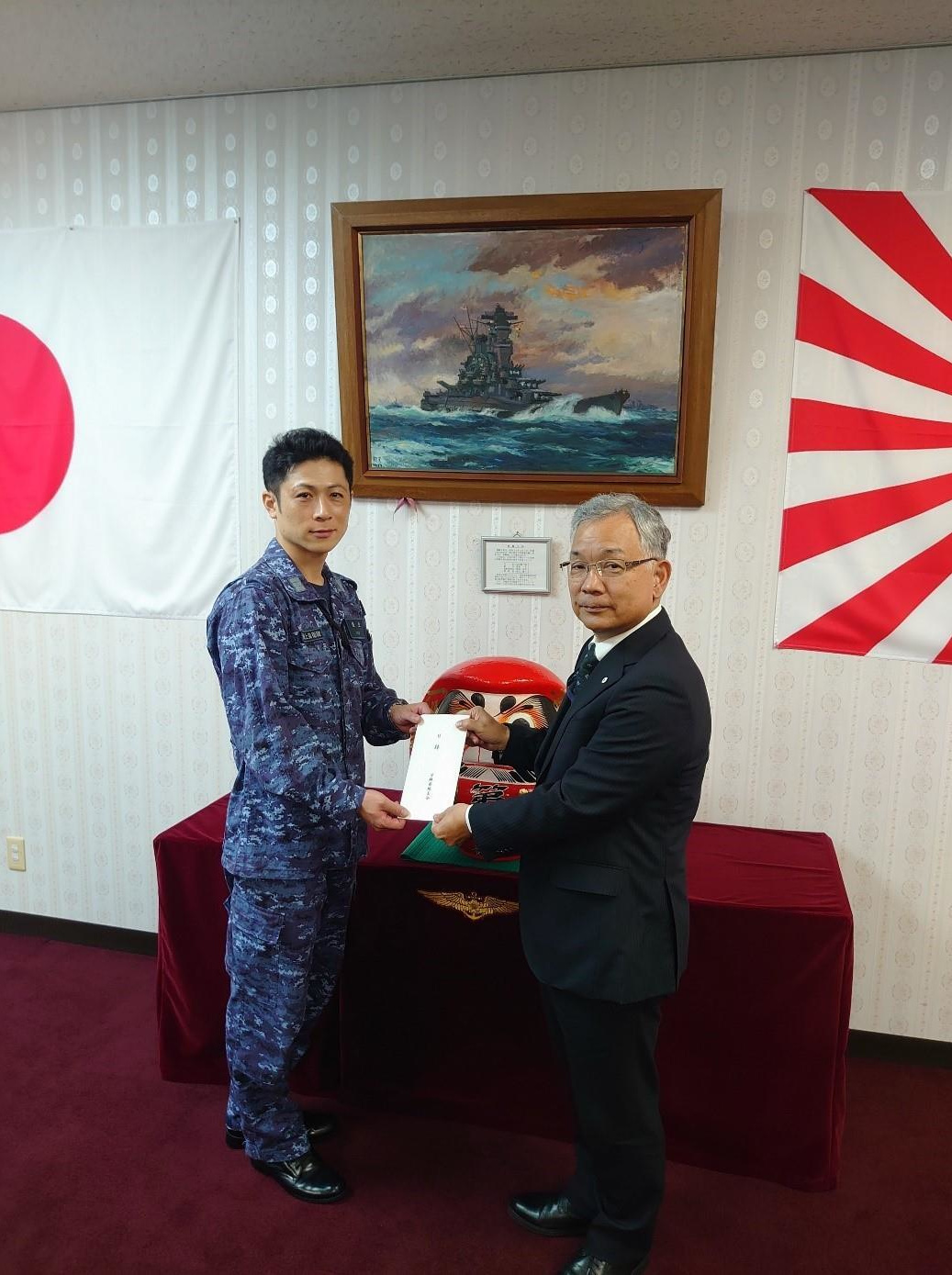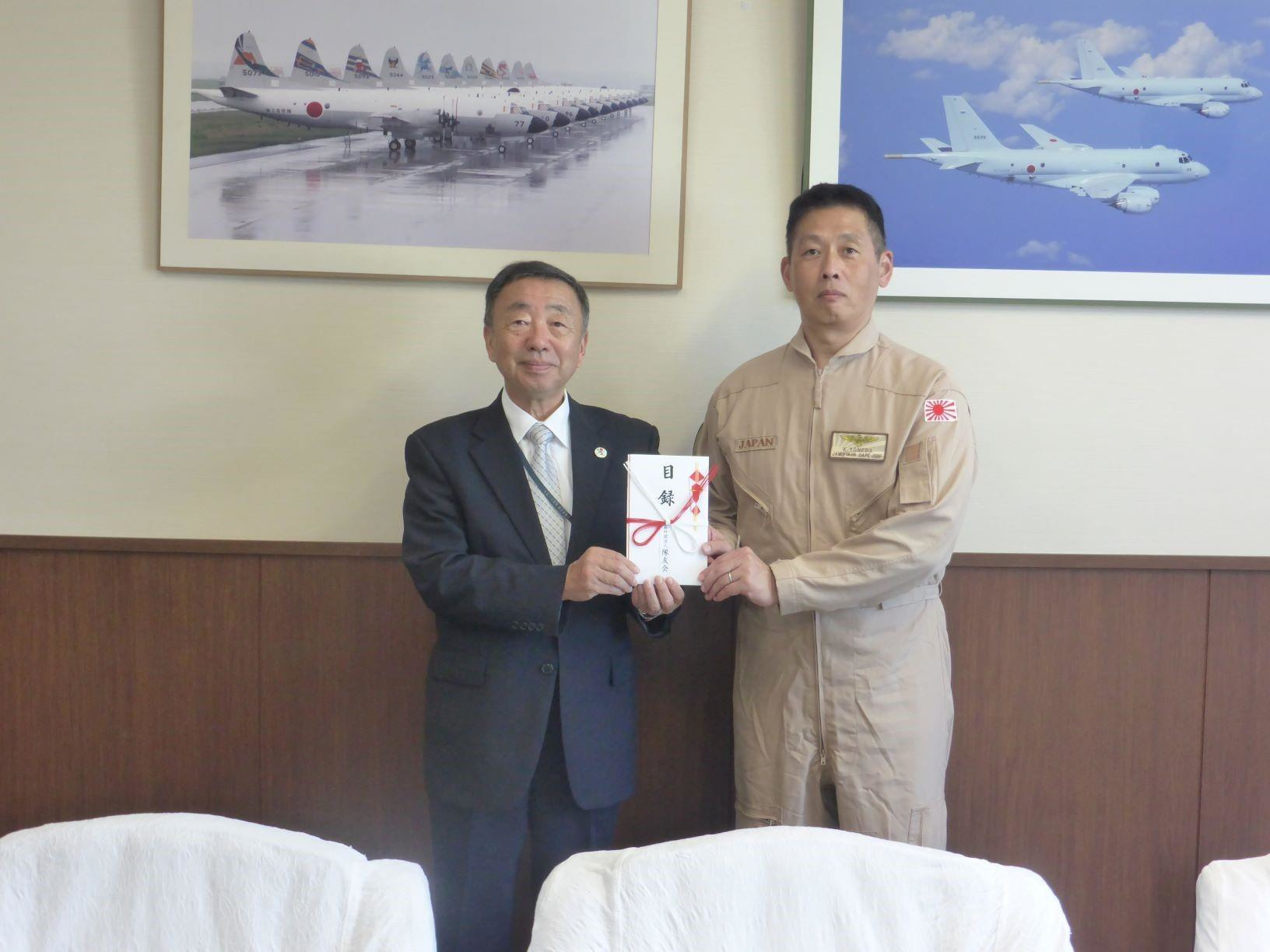 5空群監理幕僚の田辺3海佐に激励品を手交する中原事務局長(当時)