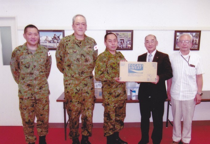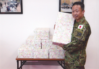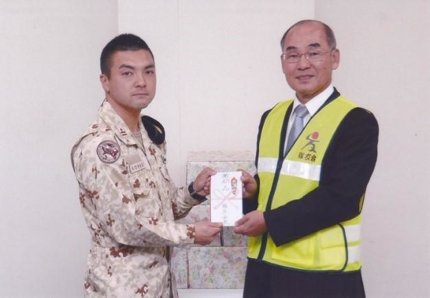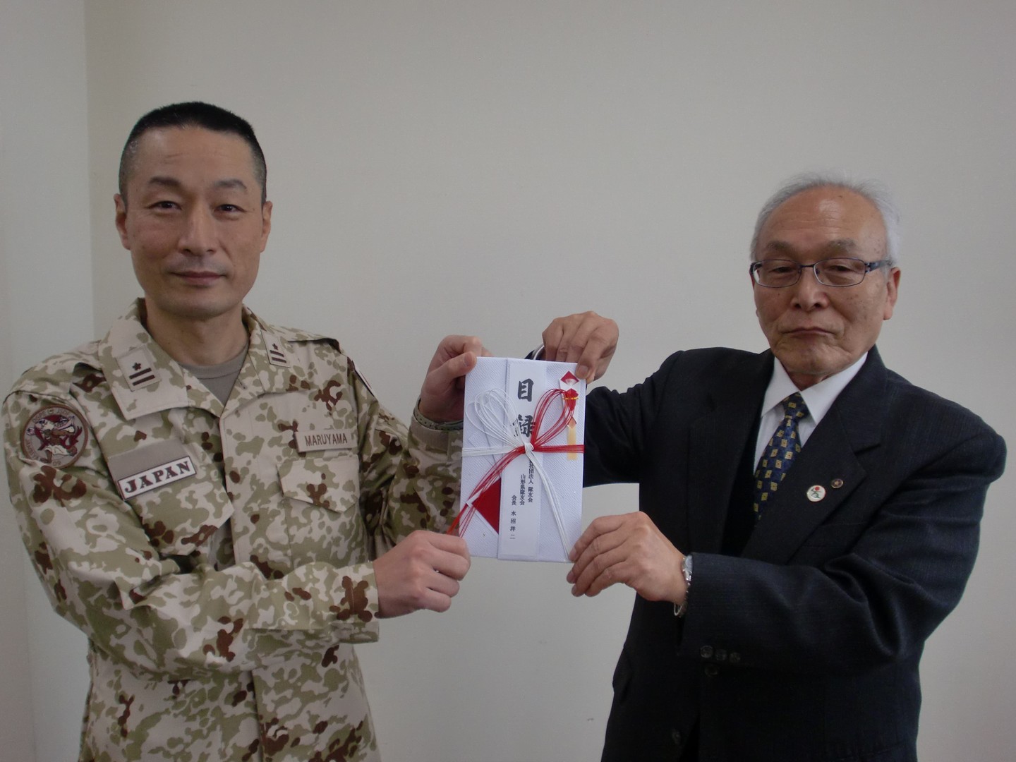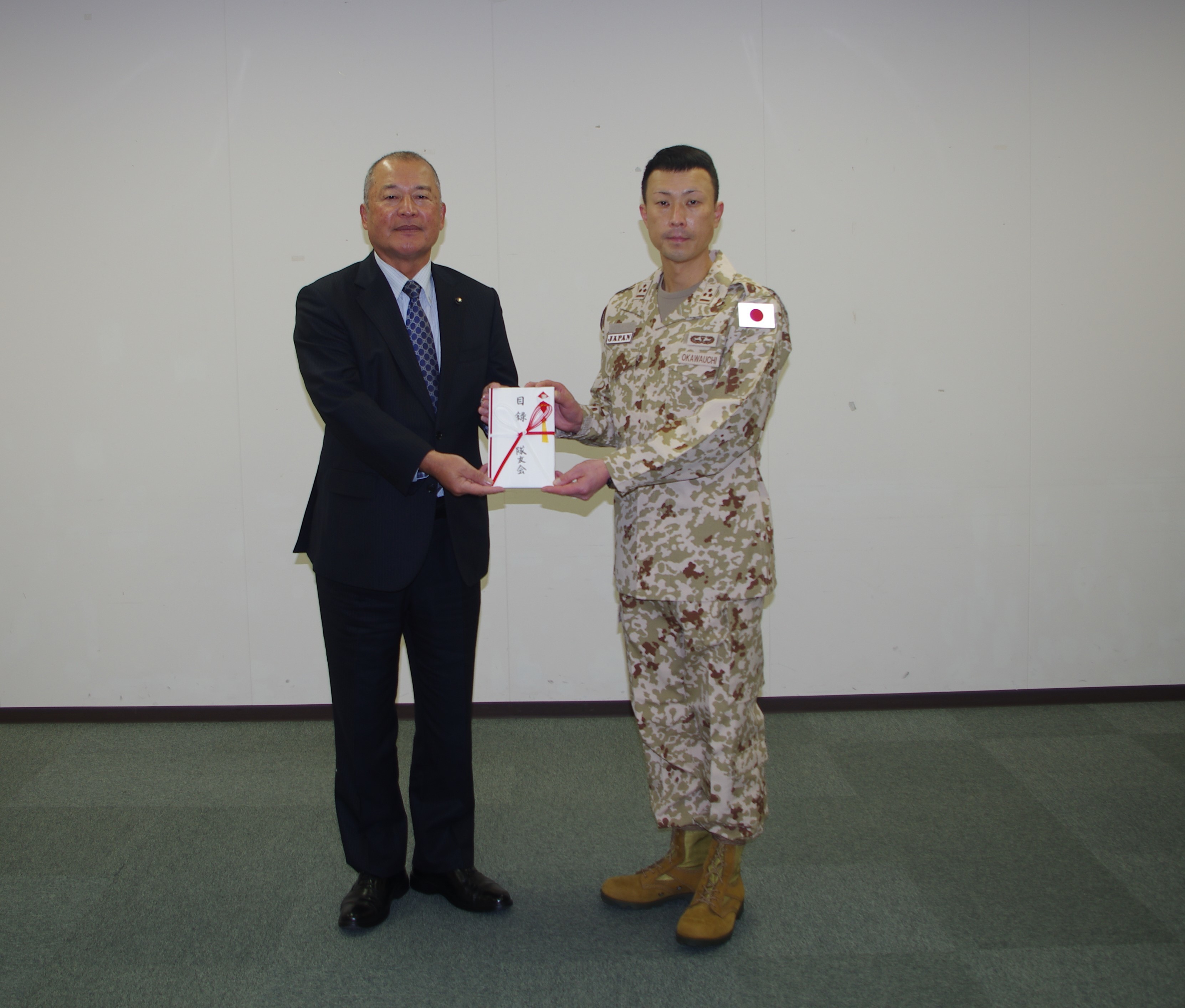 懇談後、狩野会長から、派遣隊員を代表して警衛隊長・西隼人3等陸佐に「今後約6カ月間、異国の地で、日本とは比較にならない酷暑の厳しい環境の中での任務遂行となるが、ぜひ、困難を克服し派遣任務を完遂して、無事の帰国をして頂きたい」との思いを込め激励品を手渡した。(増田広報部長)