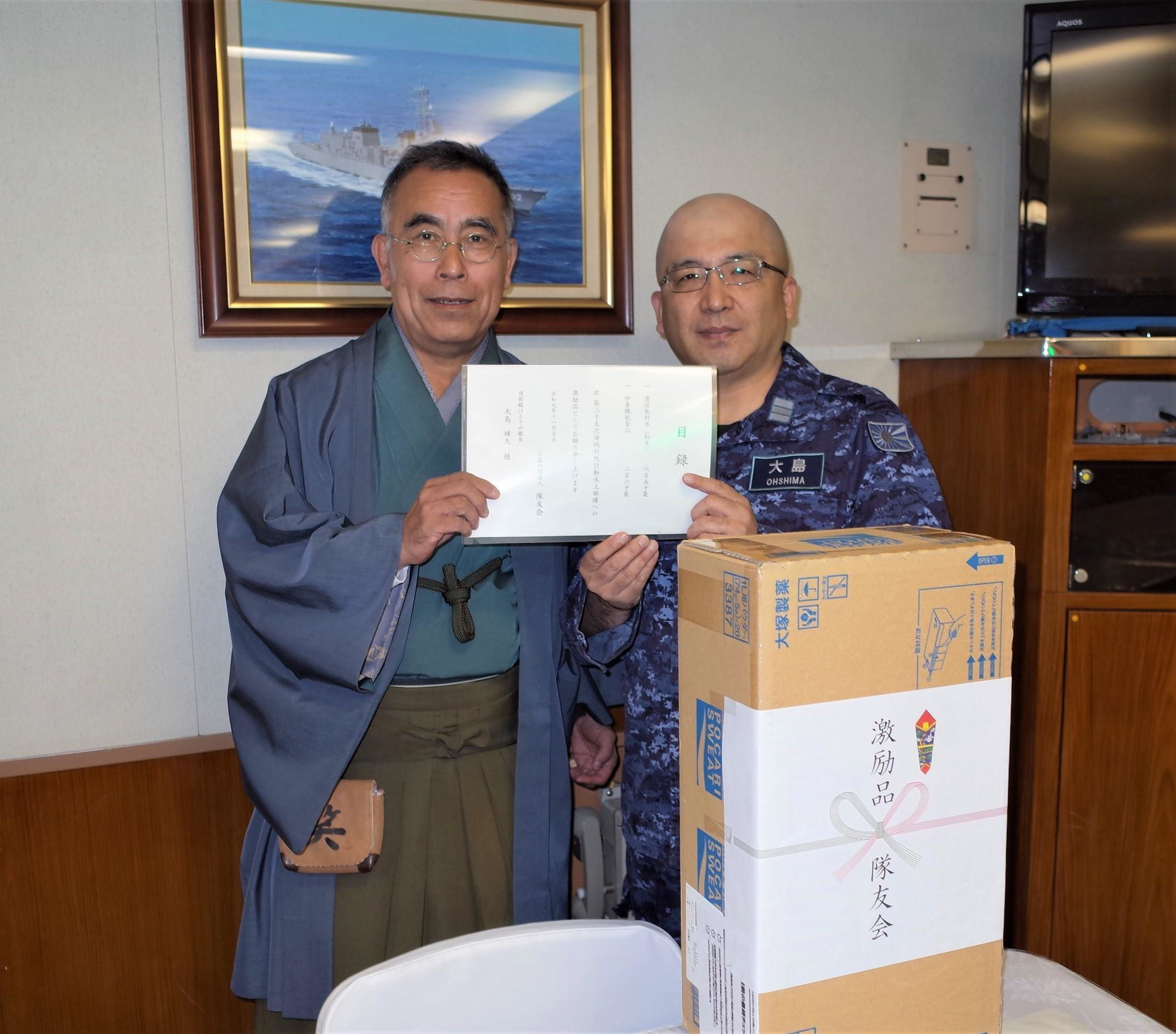 出国に先立つ1月31日、「さざなみ」を訪問し隊友会を代表して寺尾広島県隊友会長が激励品を贈呈した。