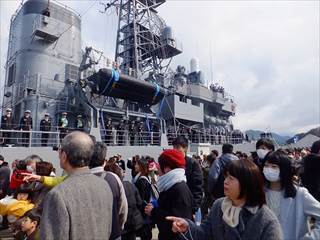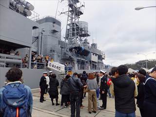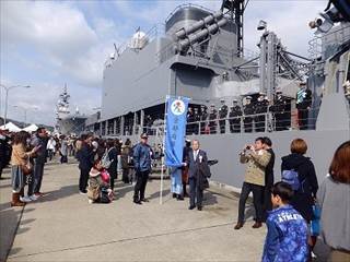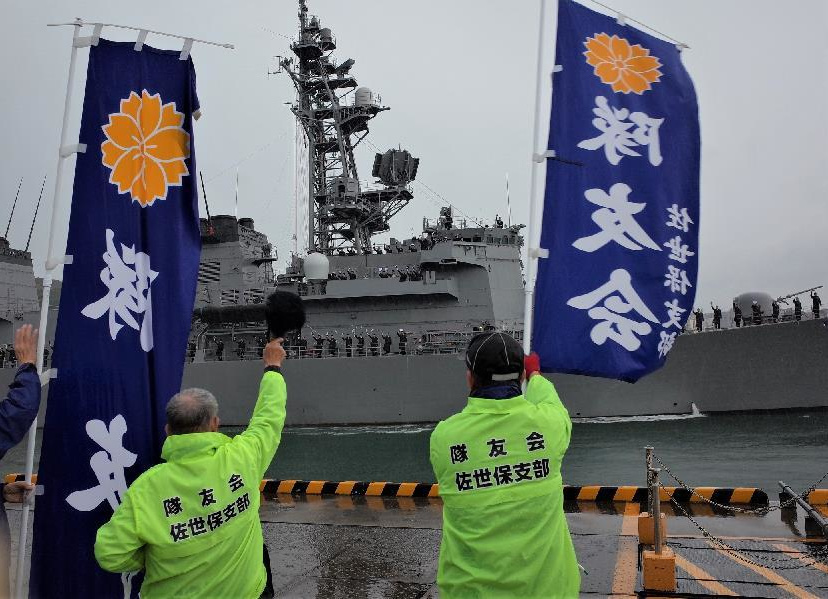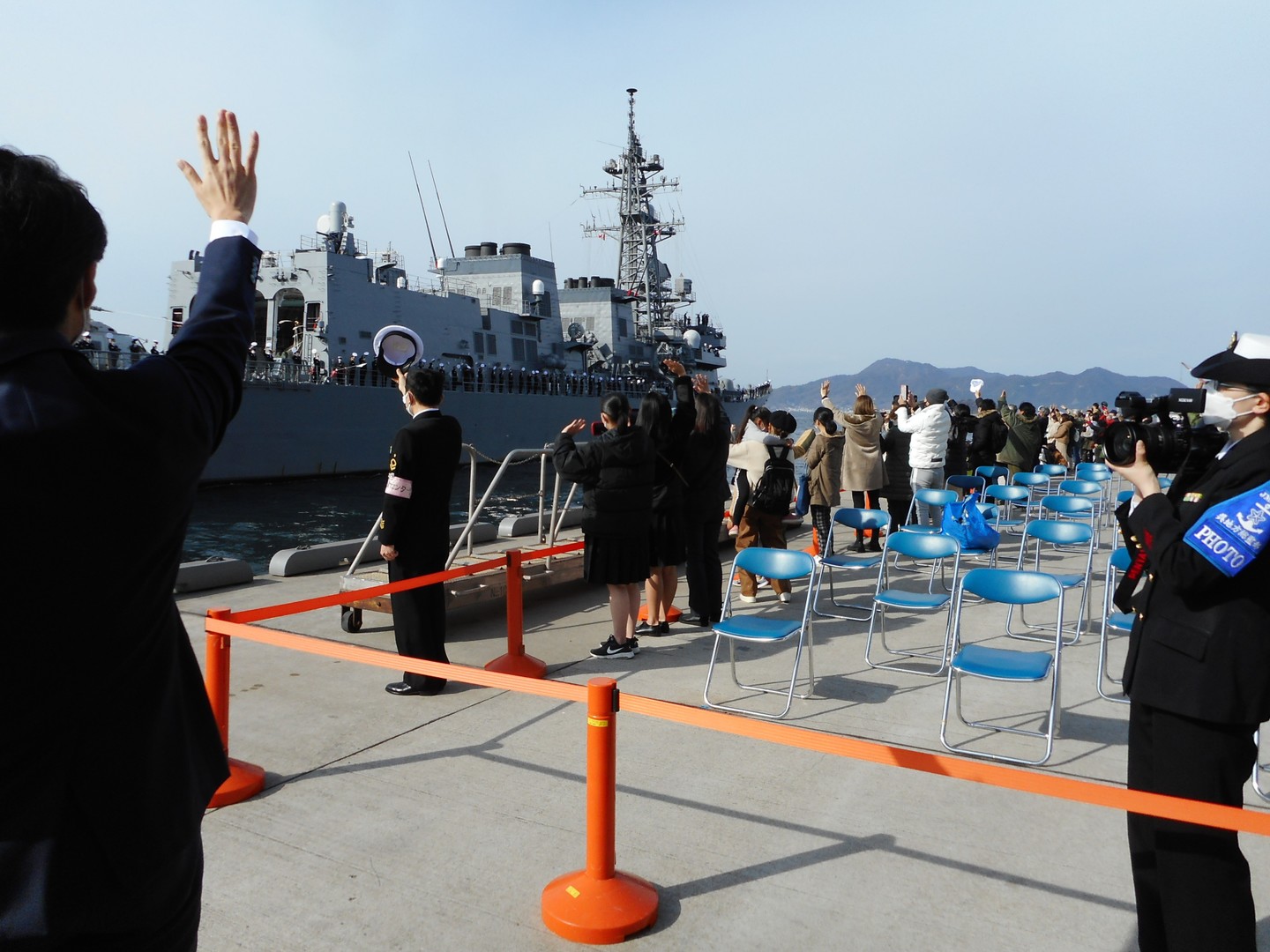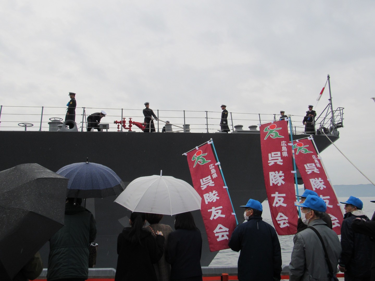 この日、隊員及び隊員家族等約500名とともに、広島県隊友会(会長・寺尾憲治)呉支部(支部長・豊澤幸徳)の会員8名が激励・見送りを行った。また、出港後には同艦が通過する大須瀬戸で会員8名が呉隊友旗を掲げて激励・見送りを実施した。