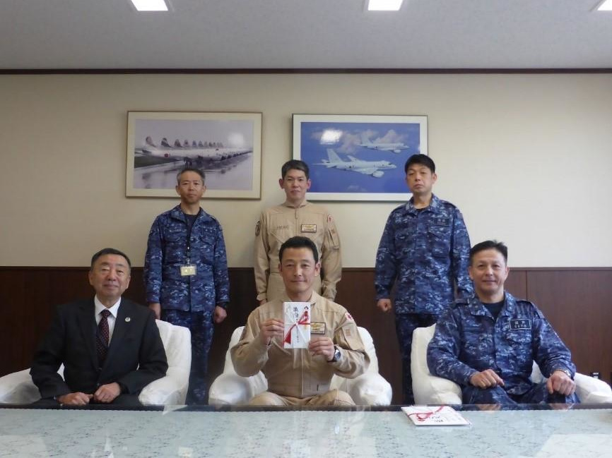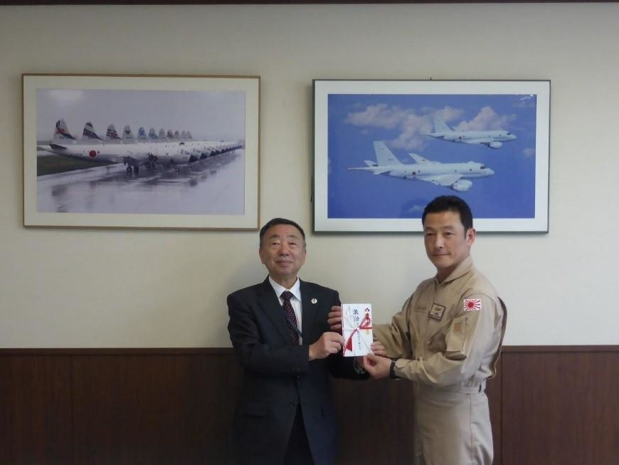 出国に先立つ2月22日、青森県隊友会(会長・堀内直樹)小笠原治仁・三八地域支部長は第2航空群司令を表敬し、任務の完遂と無事の帰国を願い隊友会からの激励品を託した。(理事役・小清水吉弘)