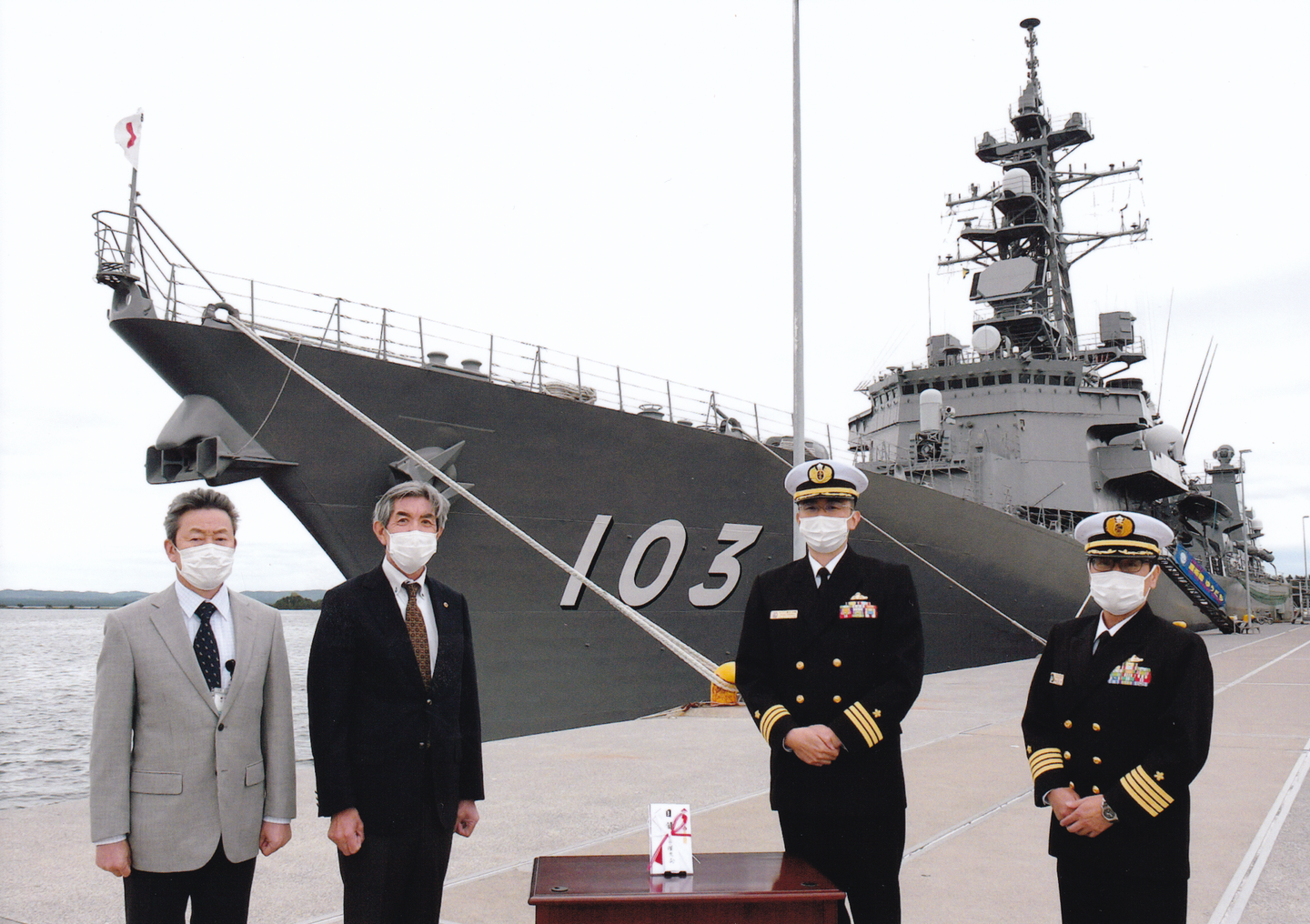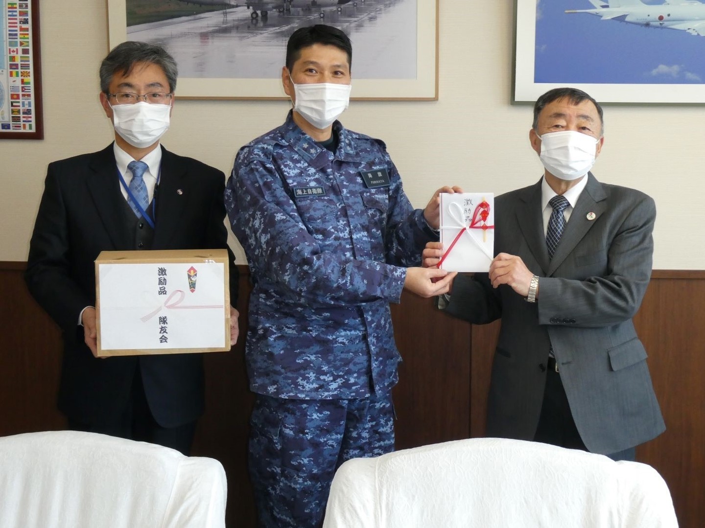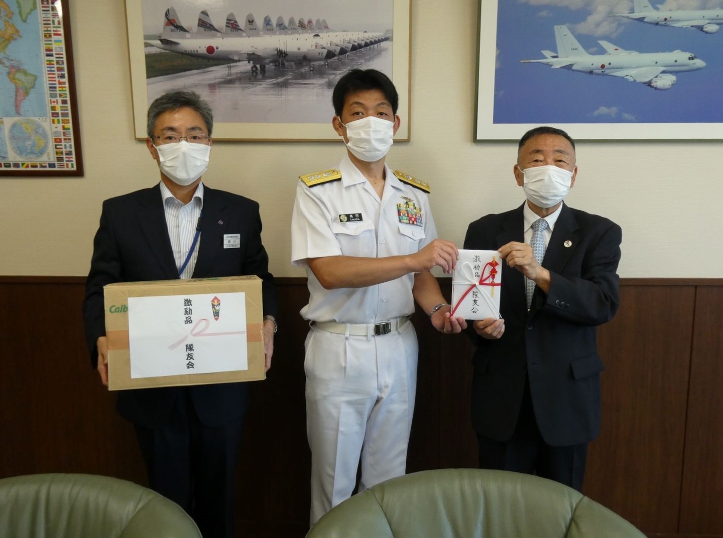 青森県隊友会下北支部からは、大久嘉範・副支部長及び阿部稔・幹事長が出席し、藤井第7護衛隊司令及び野瀬「まきなみ」艦長に、除菌ウエットテッシュなどの激励品を贈呈した。藤井司令からは「コロナ禍でもあり除菌グッズはとてもありがたい」との御礼の言葉があった。