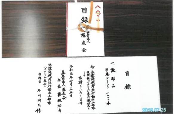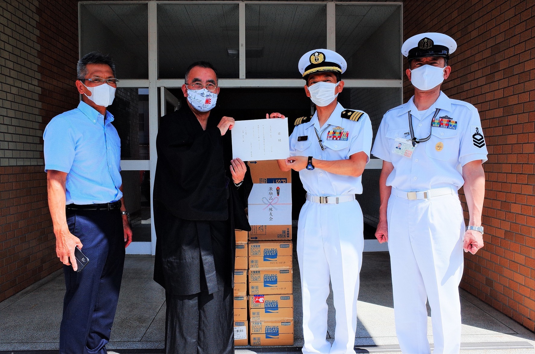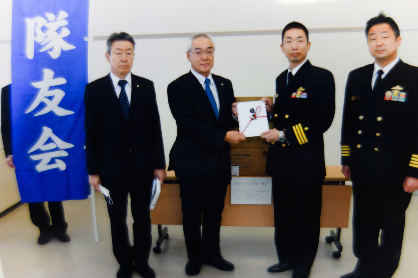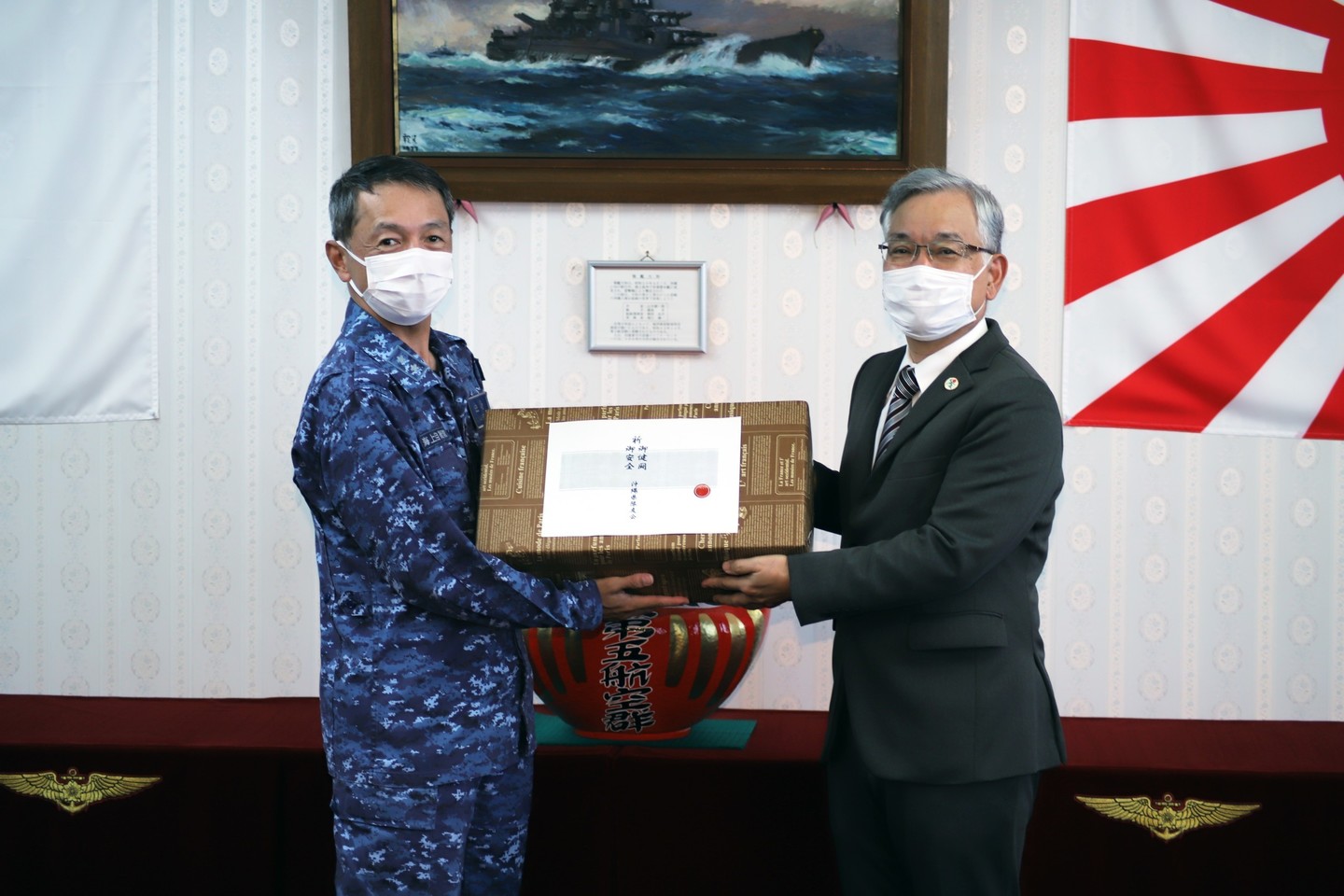 青森県隊友会下北支部からは、大久嘉範・副支部長及び阿部稔・幹事長が出席し、藤井第7護衛隊司令及び野瀬「まきなみ」艦長に、除菌ウエットテッシュなどの激励品を贈呈した。藤井司令からは「コロナ禍でもあり除菌グッズはとてもありがたい」との御礼の言葉があった。
