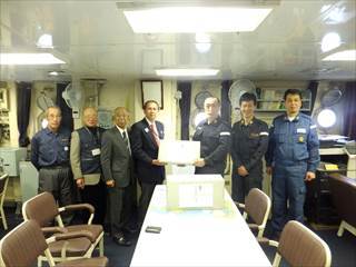 「まきなみ」野瀬艦長に目録を手交する大久副支部長