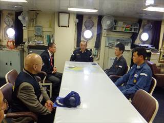 士官室で副艦長及び先任伍長同席の元、佐藤艦長から派遣間の安全対策、心構え、隊員の健康管理等現地で予想される事案対応について説明を受け、大変頼もしく感じた。