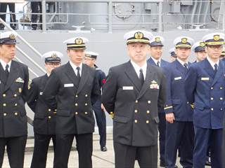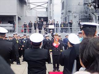 ソマリア沖・アデン湾に向けた出港の準備状況及び海賊対処行動水上部隊についての説明を聞き、今回の最多参加(4回目)隊員である廣光智先任伍長の紹介があり、その後、指揮官以下乗員の安全なる航海を祈り、石川指揮官・当直士官等の見送りを受け、護衛艦「さざなみ」を後にした。