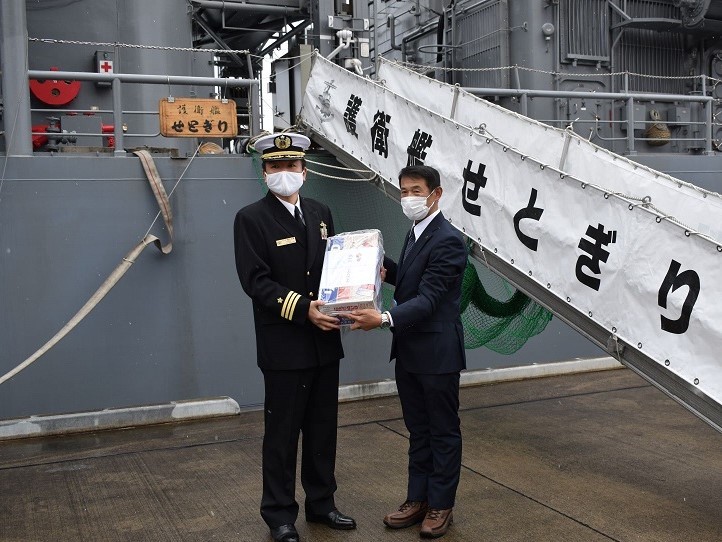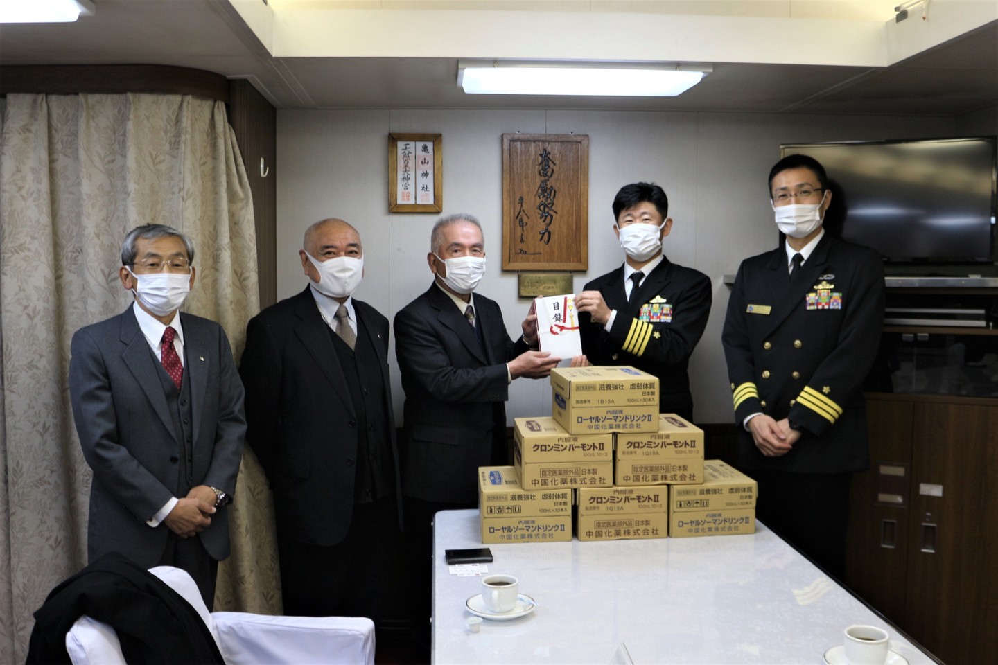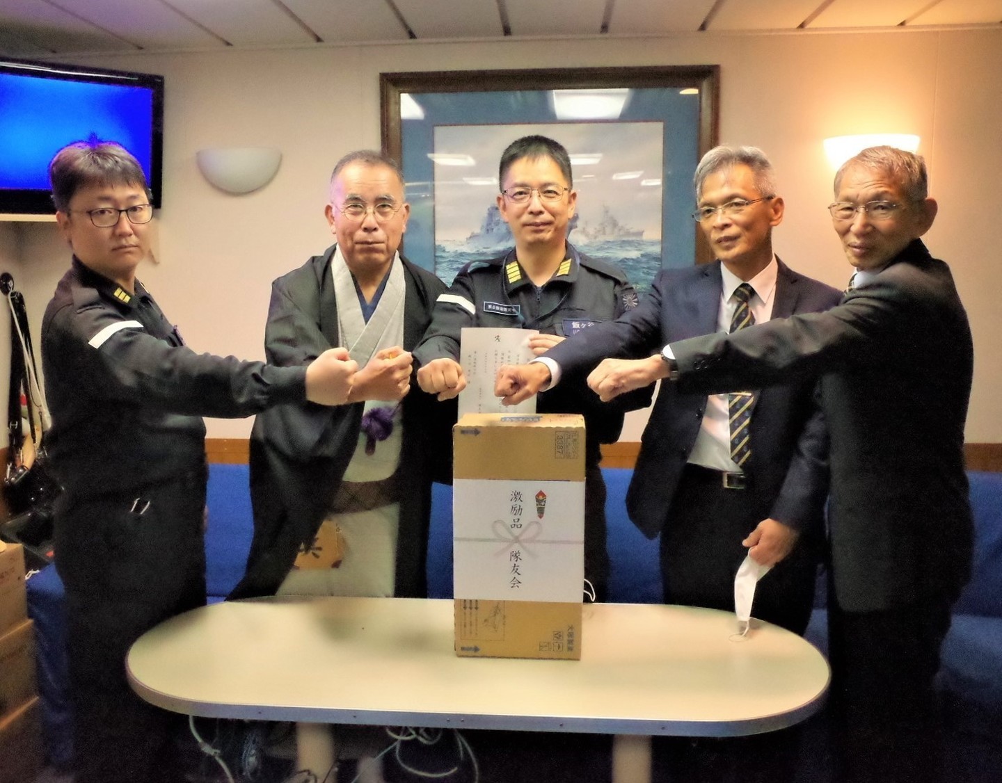 これに先立ち、1月19 日、第38 次派遣海賊対処行動水上部隊指揮官佐藤伸哉2等海佐(「せとぎり」艦長)に対し、京都府隊友会長代理村上舞鶴支部長から激励品を贈呈した。贈呈式は、新型コロナウイルス感染による緊急事態宣言発令中のため、北吸岸壁において、鶴地方総監部管理部長小関昌彦1等海佐、隊友会からは柴田府広報理事役、長井舞鶴支部会計が同席して行った。佐藤艦長からは、派遣に向けての態勢と心構えについての心強い説明があった。
