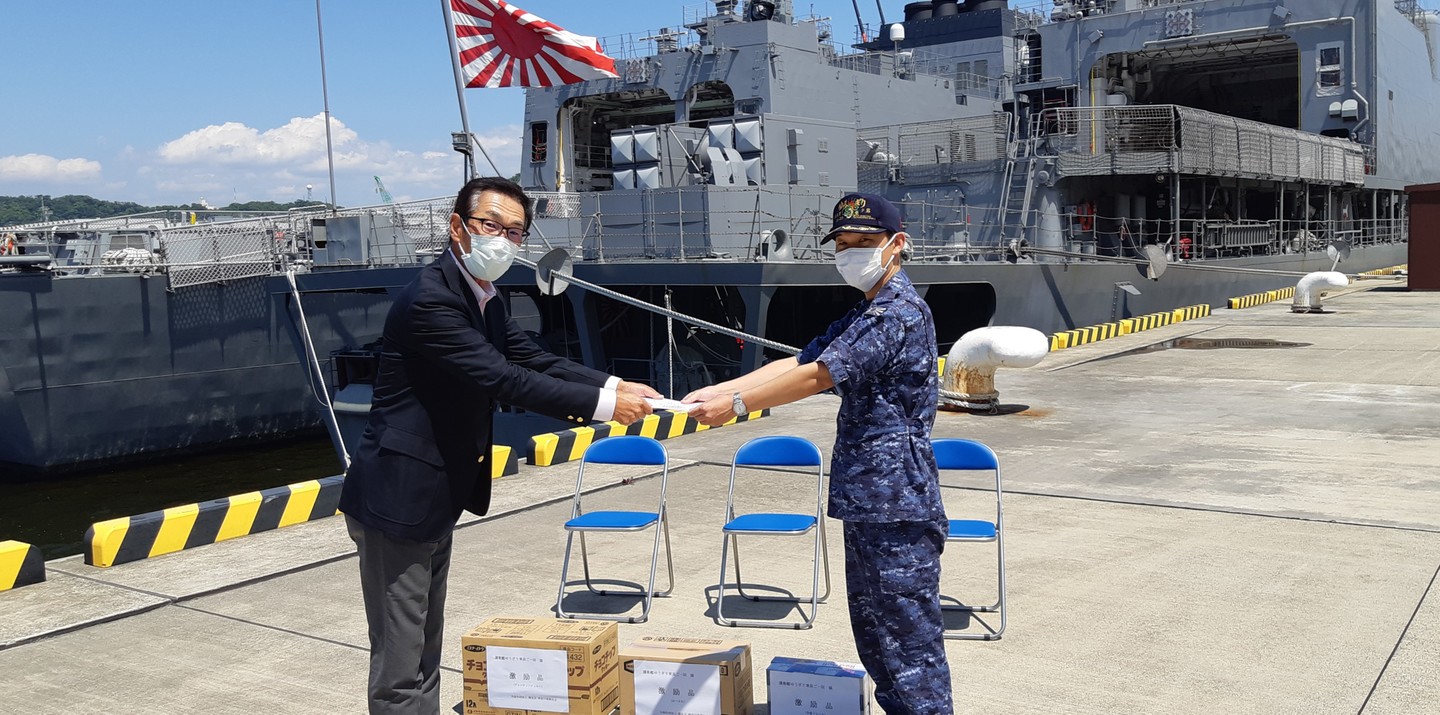 6月1日、濱田暢喜神奈川県隊友会横須賀支部長は、矢木同事務局長とともに、護衛艦ゆうぎり(艦長・熊代威2等海佐)が出国準備中の海自横須賀基地逸見岸壁を訪れ、神奈川県隊友会(会長・松岡貞義)からの激励品を贈呈した。濵田支部長は松岡会長からの激励文を伝達するとともに激励品を艦長に贈呈、艦長は、「このようにたくさんの激励品を頂き、乗員一同大変感謝しています。元気に任務を遂行してきます」と述べた。