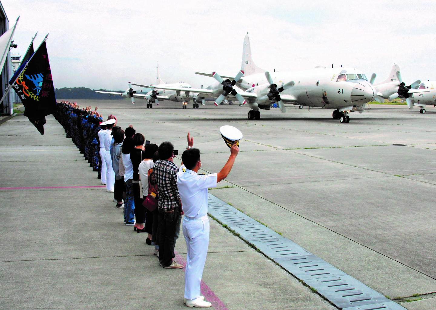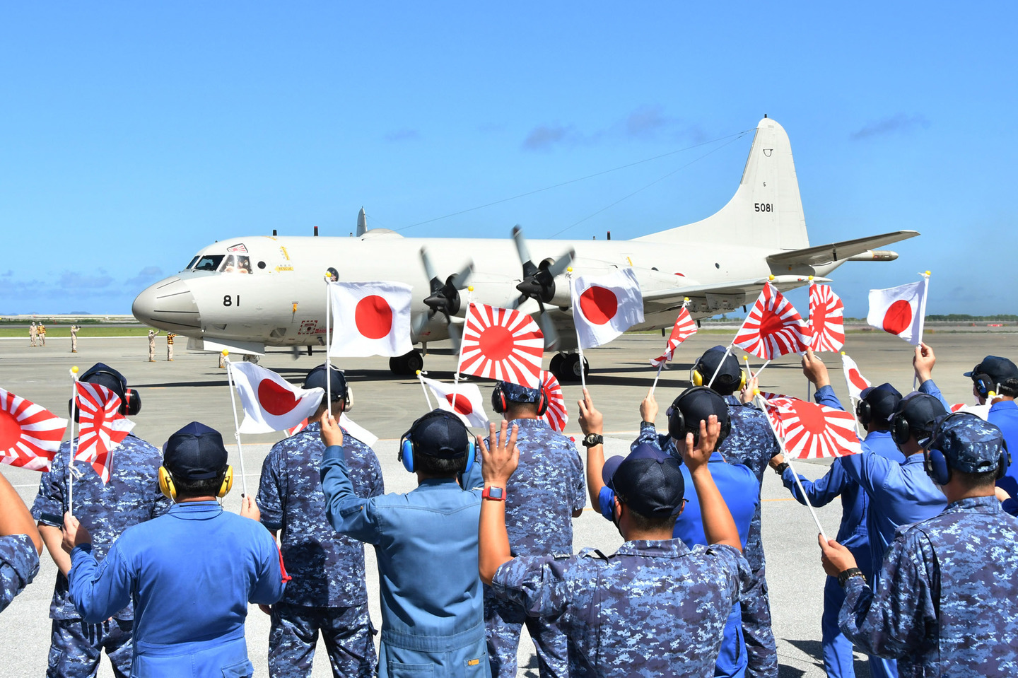 那覇航空基地から出国する第44次派遣海賊対処行動航空隊のP─3C哨戒機と 見送りをする海自隊員(統幕提供)