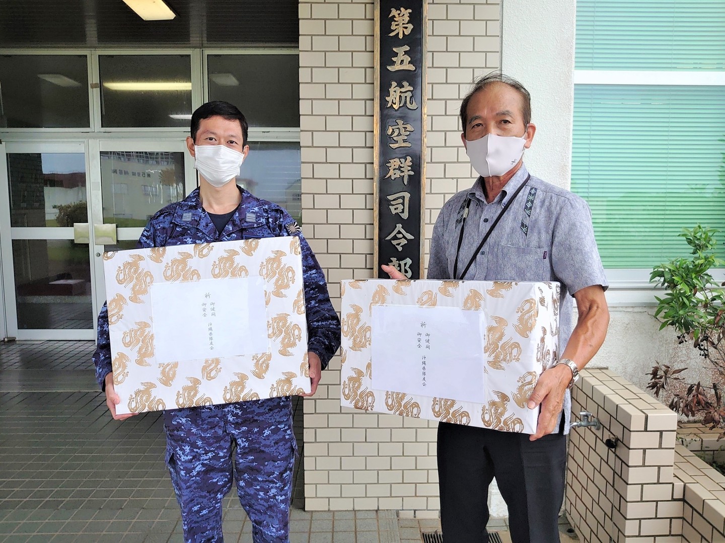 出発に先立つ11月2日、沖縄県隊友会(会長・平田喜彦)は第5航空群司令部を訪問し、降旗群司令に、隊友会からの激励品を贈呈した。