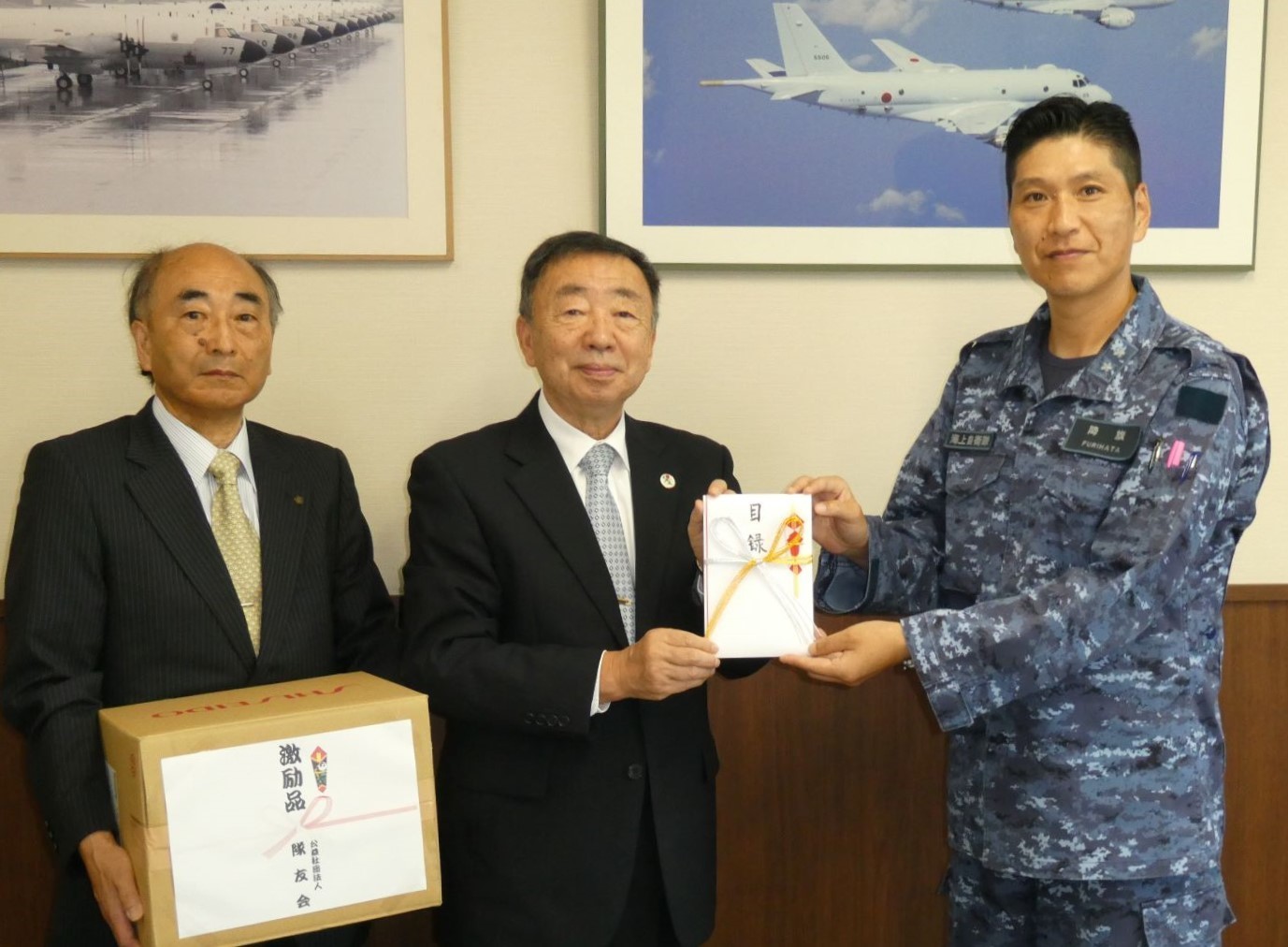 これに先立ち8月8日、第2航空群司令に青森県隊友会(会長・堀内直樹)三八地域支部小笠原治仁支部長が、任務の完遂と無事の帰国を願い隊友会からの激励品を託した。