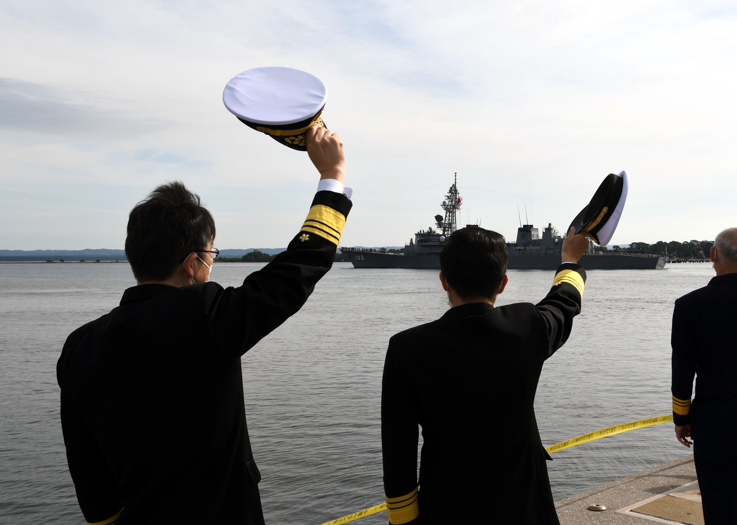 出港する「ゆうだち」を見送る湯浅自衛艦隊司令官ほか(大湊総監部提供)