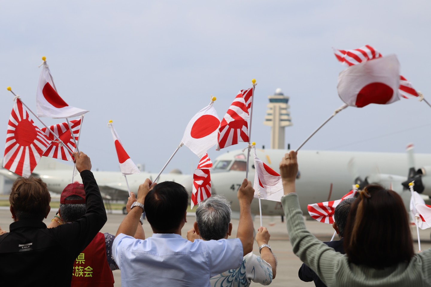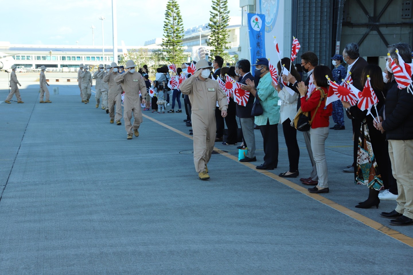 出国に当たっては、派遣される約60名の隊員の任務完遂と安全への祈りを込め、第5航空群の隊員と派遣隊員のご家族、協力団体約80名(沖縄県隊友会10名を含む)が盛大に見送った。