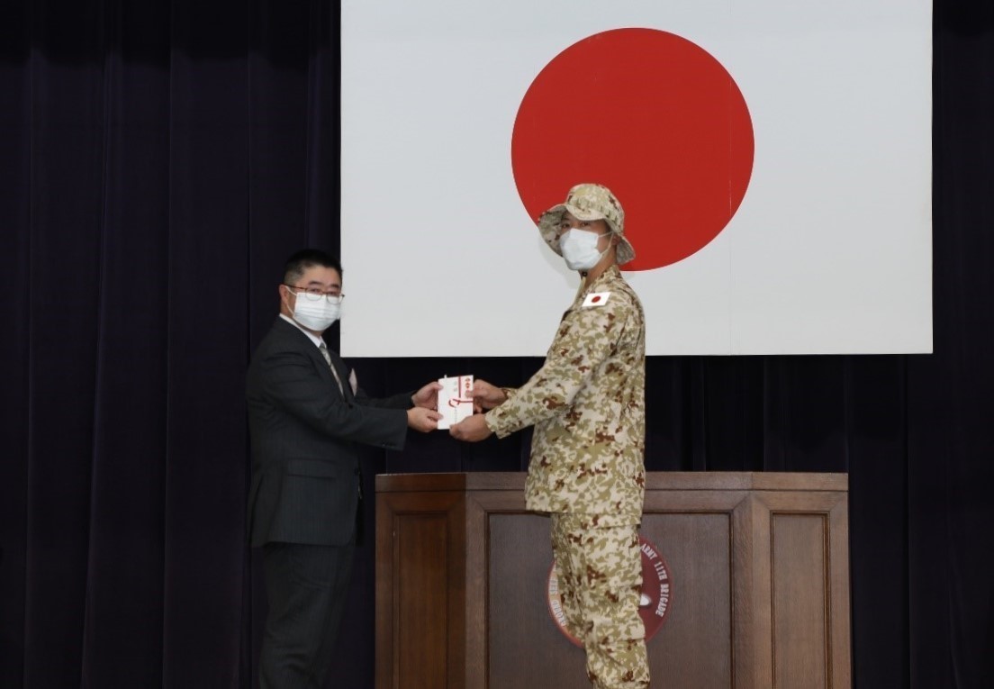 令和元年12月20日(金)、遠軽駐屯地(司令・大野木秀樹1佐)の年末行事において実施された第13次派遣海賊対処行動支援隊要員の紹介行事に旭川地方隊友会長代理として遠軽支部長が参加し、派遣隊員代表の能登恒1等陸尉に激励品(隊員要望のポカリスエット等の飲料水)を贈呈し、任務を完遂と全員無事の帰隊を祈念した。