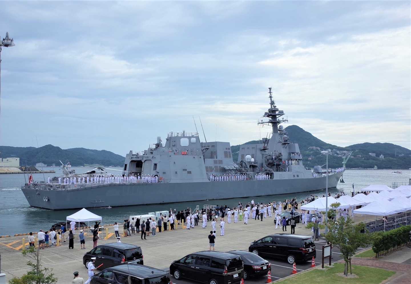 行事は、防衛副大臣・井野俊郎、自衛艦隊司令官・湯浅英樹海将、佐世保地方総監・西成人海将をはじめとする各級指揮官、隊員のほか、来賓として朝長則男佐世保市長、県・市議会議員、支援団体の代表らが参列し、多くの乗員家族が見守るなか実施された。