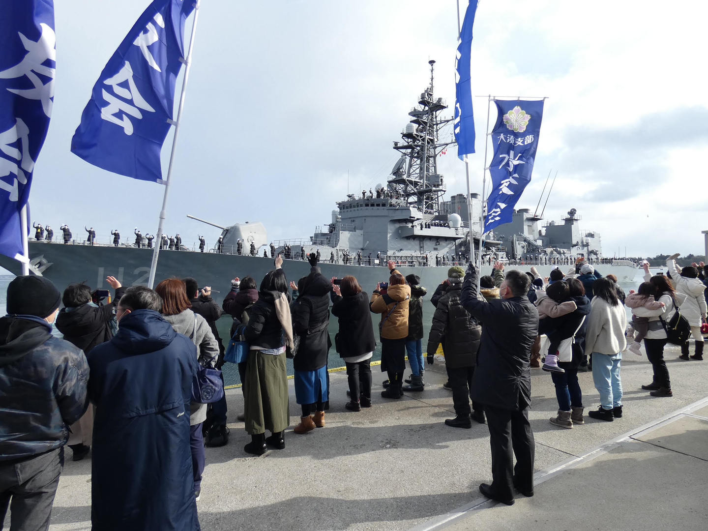 1月22日、第44次派遣海賊対処行動水上部隊(情報収集活動兼務)として派遣される第7護衛隊司令・藤井健一1等海佐を指揮官とする護衛艦「まきなみ」(艦長・野瀬浩司2等海佐)の出国行事が、海上自衛隊大湊基地で行われた。