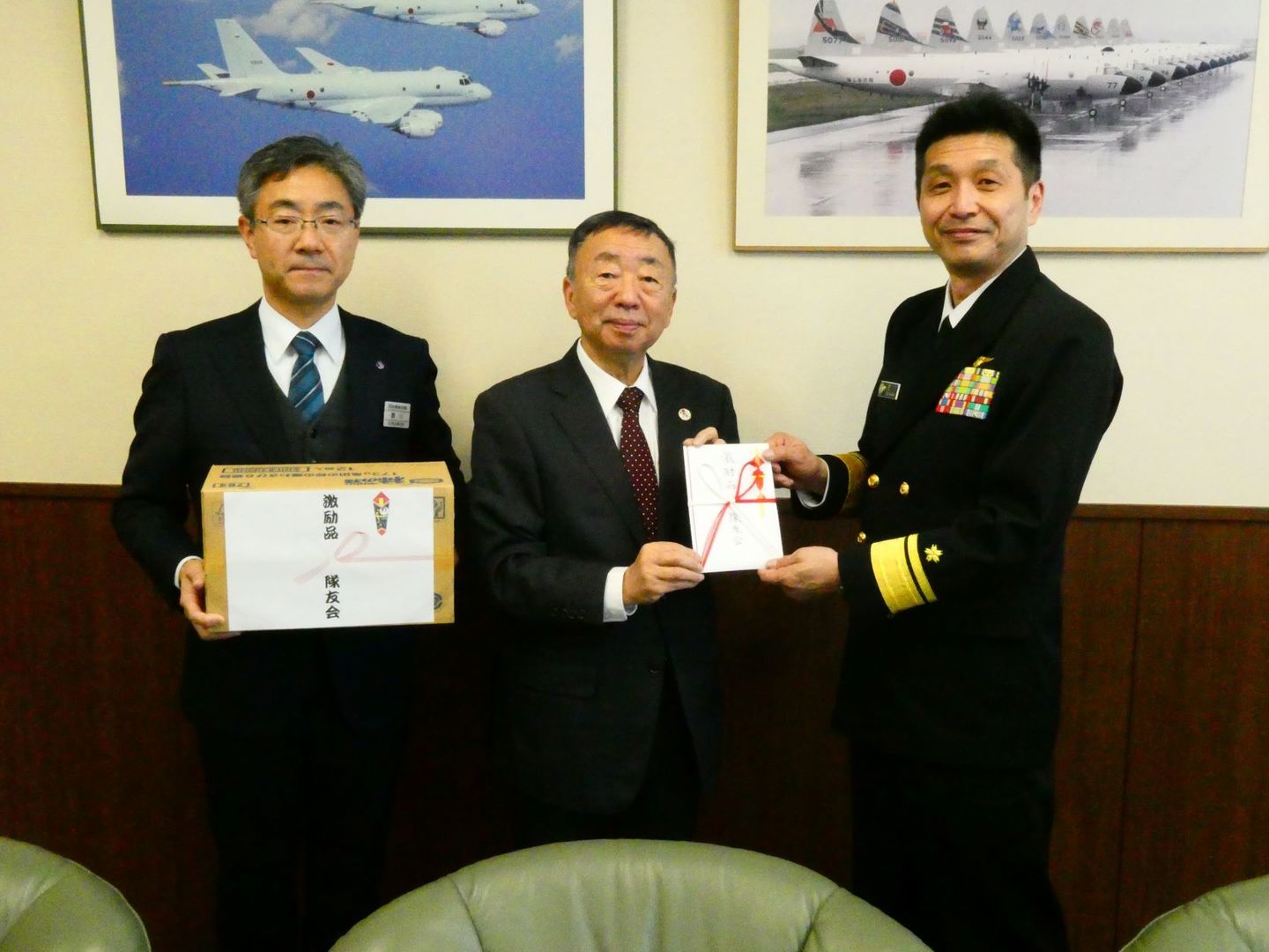 令和2年1月8日(水)、平田喜彦沖縄県隊友会長及び中原誠同事務局長は、沖縄県那覇市に所在する海上自衛隊第5航空群司令部を訪れ、海上自衛隊第5航空群司令金嶋浩司海将補同席のもと、同年1月11日(土)に出国する第38次派遣海賊対処行動航空隊司令稲生修一2等海佐に激励品(隊員希望の粉末スポーツドリンク)を手交し、派遣期間の安全と任務完遂を祈念した。