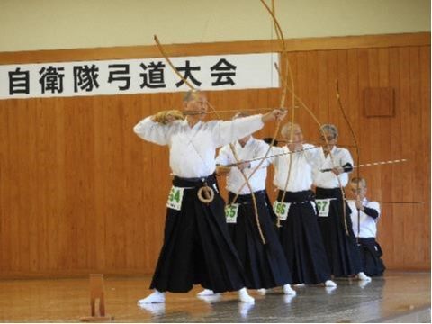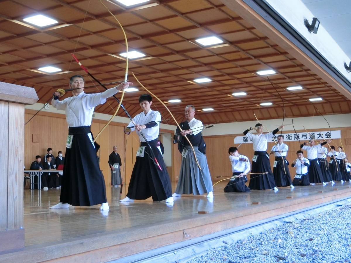 快晴の青空の下、10時から競技が開始され、各自四つ矢2回の的中制で団体戦と個人戦(団体戦の成績が個人戦の成績を兼ねる)を行い、優勝チーム、射道最優秀チーム及び五段以上の部優勝者には防衛大臣賞状と防衛大臣杯が、また、隊友の部優勝者(称号の部、有段の部)には隊友会理事長賞が贈られた。