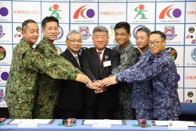 令和2年2月19日沖縄県隊友会(会長:平田喜彦)は、航空自衛隊那覇基地内合同庁舎において陸上自衛隊那覇駐屯地、海上自衛隊第5航空群(那覇基地)、海上自衛隊沖縄基地隊(うるま市)、航空自衛隊那覇基地、沖縄地方協力本部及び公益社団法人沖縄県自衛隊家族会との7者間で「大規模災害時等における派遣隊員の家族支援に対する協力に関する協定」を関係する部隊長・司令等、県家族会地区会会長及び県隊友会支部長の立会いの中締結しました。県内に陸海空自衛隊が所在するため、3幕合同での協定は全国初となります。