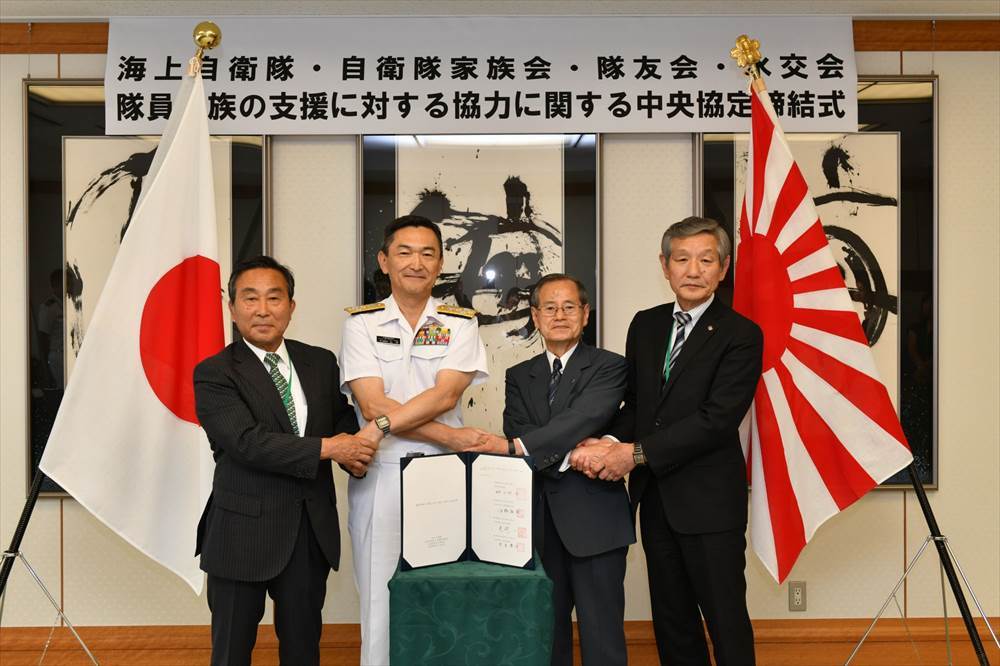 令和元年6月3日(月) 防衛省海上幕僚監部応接室にて海上自衛隊との「隊員家族の支援に対する協力に関する協定」の中央協定締結式が行われ、山村浩海上幕僚長、伊藤康成自衛隊家族会会長、先崎一隊友会理事長及び赤星慶治水交会理事長がそれぞれ協定書に署名押印した。