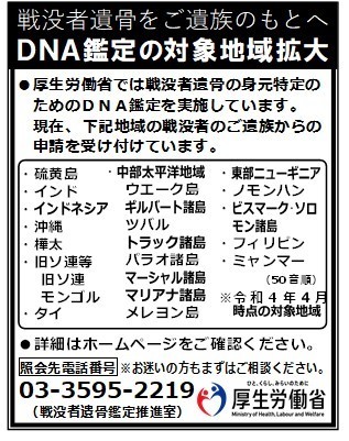厚生労働省では遺留品等の手掛かり情報がない戦没者遺骨の身元特定のためのDNA鑑定にかかる対象地域拡大と申請手続について、令和3年10月1日から受付を開始しております。
