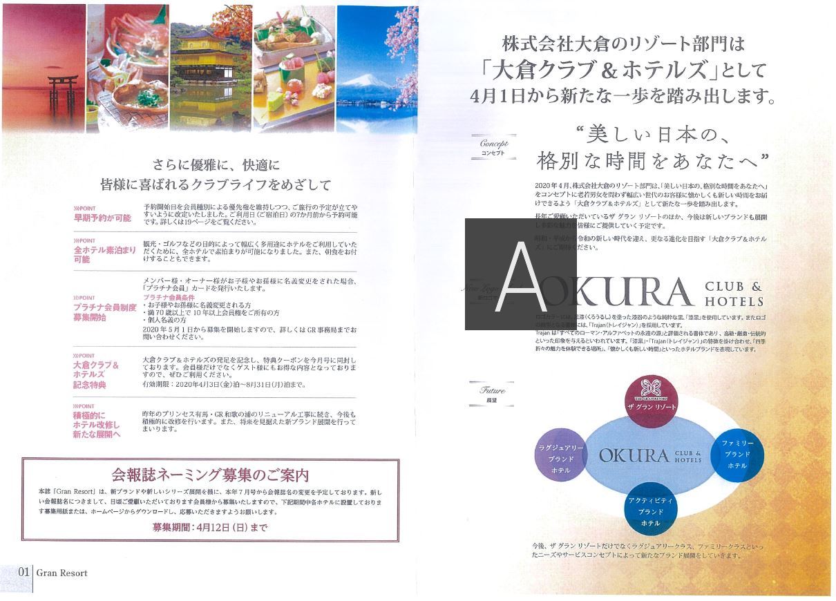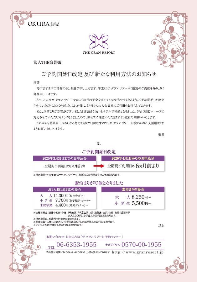 | 【お問合せ先】 | 大倉クラブ&ホテルズ事業本部 ザ グラン リゾート予約センター TEL:06-6353-1955 (営業時間9:00~18:00) |