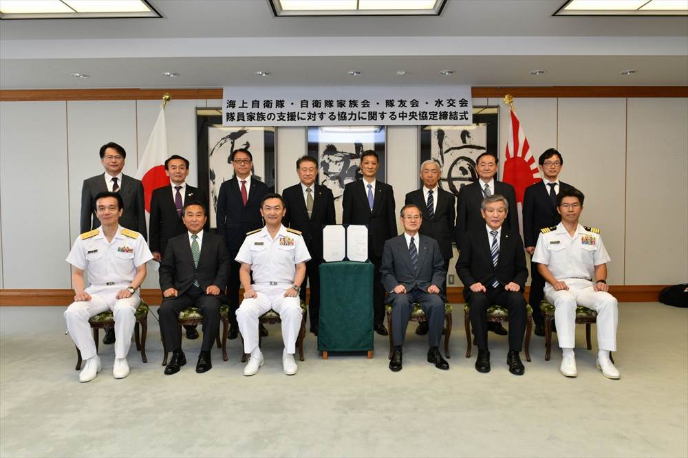 令和元年6月3日(月) 防衛省海上幕僚監部応接室にて海上自衛隊との「隊員家族の支援に対する協力に関する協定」の中央協定締結式が行われ、山村浩海上幕僚長、伊藤康成自衛隊家族会会長、先崎一隊友会理事長及び赤星慶治水交会理事長がそれぞれ協定書に署名押印した。