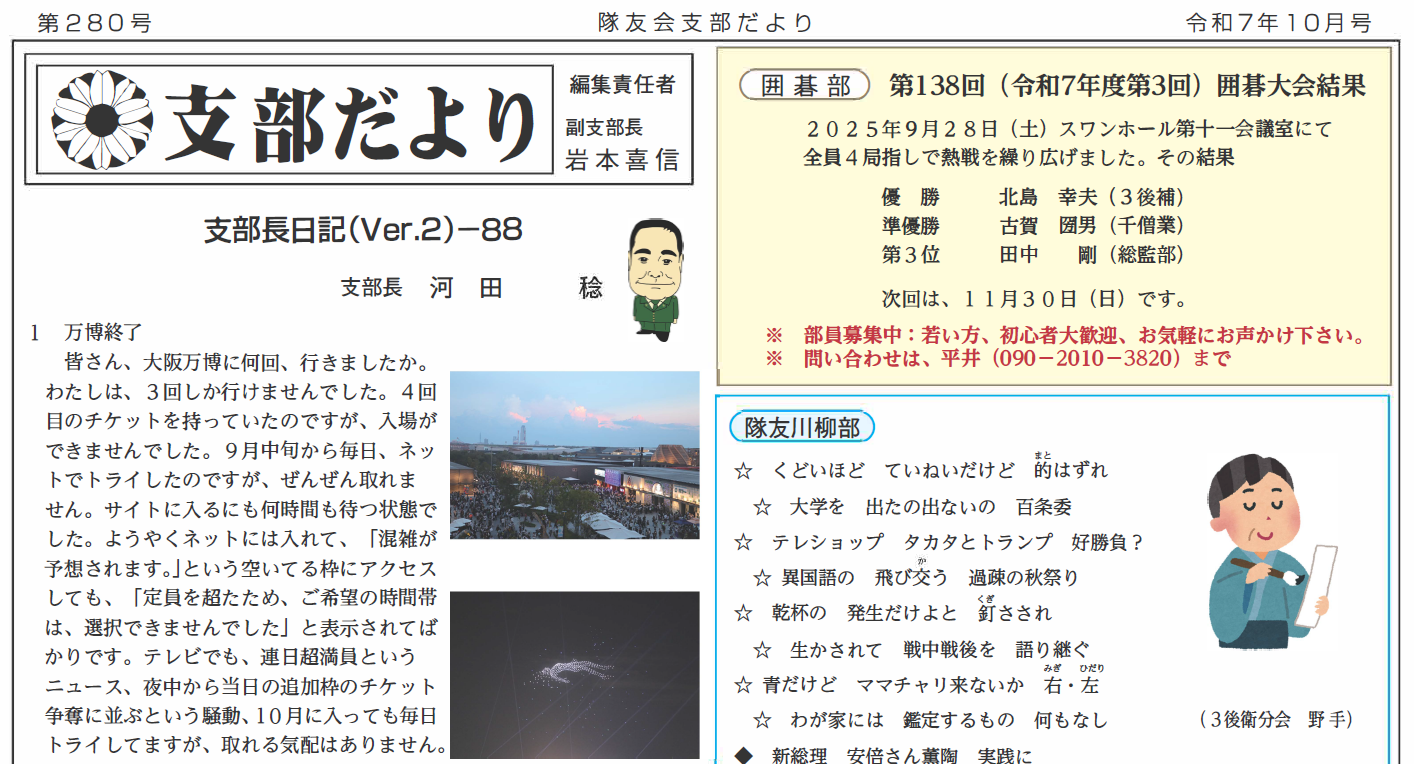 伊丹宝塚川西地域支部だより 10月号(第280号)発行のお知らせ 伊丹宝塚川西地域支部 2025.10.20 伊丹・宝塚・川西地域支部(支部長 河田 稔)は、「支部だより10月号(第280号)」を発行いたしました。 是非ご覧ください。次をクリックしてジャンプ!伊丹宝塚川西地域支部「支部だより10月(第280号)」