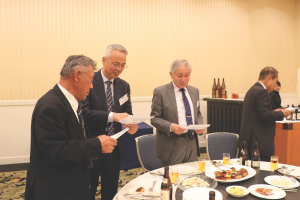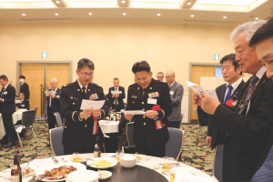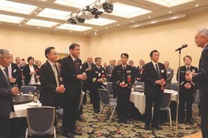 防衛講話に続いて開催した懇親会においては、小川会長挨拶で 「クマ」がキーワードとなったことから、中締めを特別顧問の熊谷氏にお願いした。会場のホテル側からは、「参加者の年齢層とは思えないほどの盛り上り、会歌合唱の迫力、飲食力など、初めての体験でした」との驚きのコメントをいただいた。