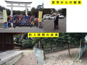 作業内容は「ゴミ拾い」「下草刈り」「笹刈」「伐採木の集積」で本殿周辺、神社入り口及び斜面の伐開でチエーンソー及び伐採機を熟練の技で進めました。