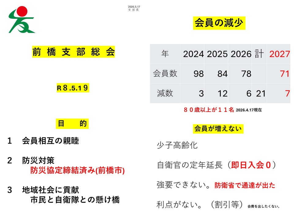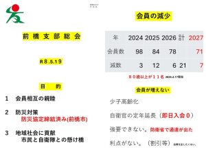 私の挨拶時に前橋隊友会の今後をプレゼンしました。内容的には会員の減少に起因する問題提起となったみたいです。