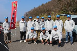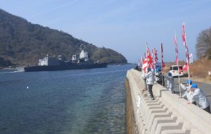 呉支部では、同校の年4回の卒業式には天候に関係なく、毎回この津久茂の瀬戸で激励・見送りを実施しており、今回は13名の会員が参加したこともあって、激励の声も一段と大きく、昨年末の幹部予定者課程の卒業生等の激励・見送りの時と同様、女性の特別会員の参加もあり華やいだ雰囲気になった。