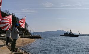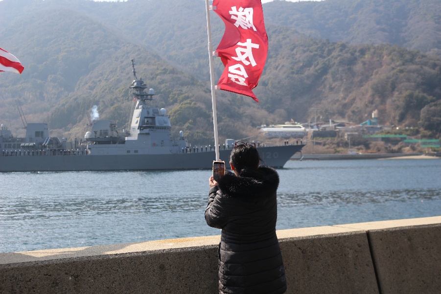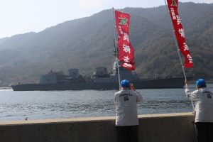 江田島居住の会員と呉市内から約1時間かけて移動した呉市居住の会員は、早朝の冷え込みが和らぐ3月上旬のような気温の昼過ぎ、卒業生を乗せた艦が通峡する予定の30分前から激励・見送りに相応しい場所で、呉隊友会の帽子及び背中に広島県隊友会・呉の名前が入った防寒ジャンパーを着用し、呉隊友会の幟、自衛艦旗及び「U・W」(「御安航を祈る」を意味する国際旗流信号)旗を準備して待機。卒業生を乗せた「練習艦やまぎり」「護衛艦しらぬい」が1列になって通峡するのに合わせ、幟・旗を振り「卒業おめでとう」「頑張って来いよ」等の激励の声をかけた。激励・見送りの声に乗艦中の卒業生からは「ありがとうございます」「頑張ります」等の力強い言葉が返ってきた。特に、今回の卒業生には女性候補生4名が含まれており、女性の良く通る高い声で返ってきた力強い言葉が印象的であった。各艦右舷上甲板に整列中の卒業生は艦内号令の「右、帽振れ」で防波堤から激励する会員に対して正帽を振り、会員も隊友会の帽子を振ってこれに応えた。卒業生は、約40日間、東南アジア方面の外洋練習航海を経て4月1日に帰国し部隊勤務ののち7月1日付で3等海尉に昇任予定である。