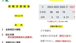 前橋支部 令和8年度前橋支部総会 令和8年4月19日(日)11時から前橋市登利平本店5階で支部総会が開催された。78名所属する支部ではあるが本日は15名の参加です。来賓に県隊友会長及び林前橋市議が来られました。私の挨拶時に前橋隊友会の今後をプレゼンしました。内容的には会員の... 2026.04.20 群馬県隊友会 前橋支部