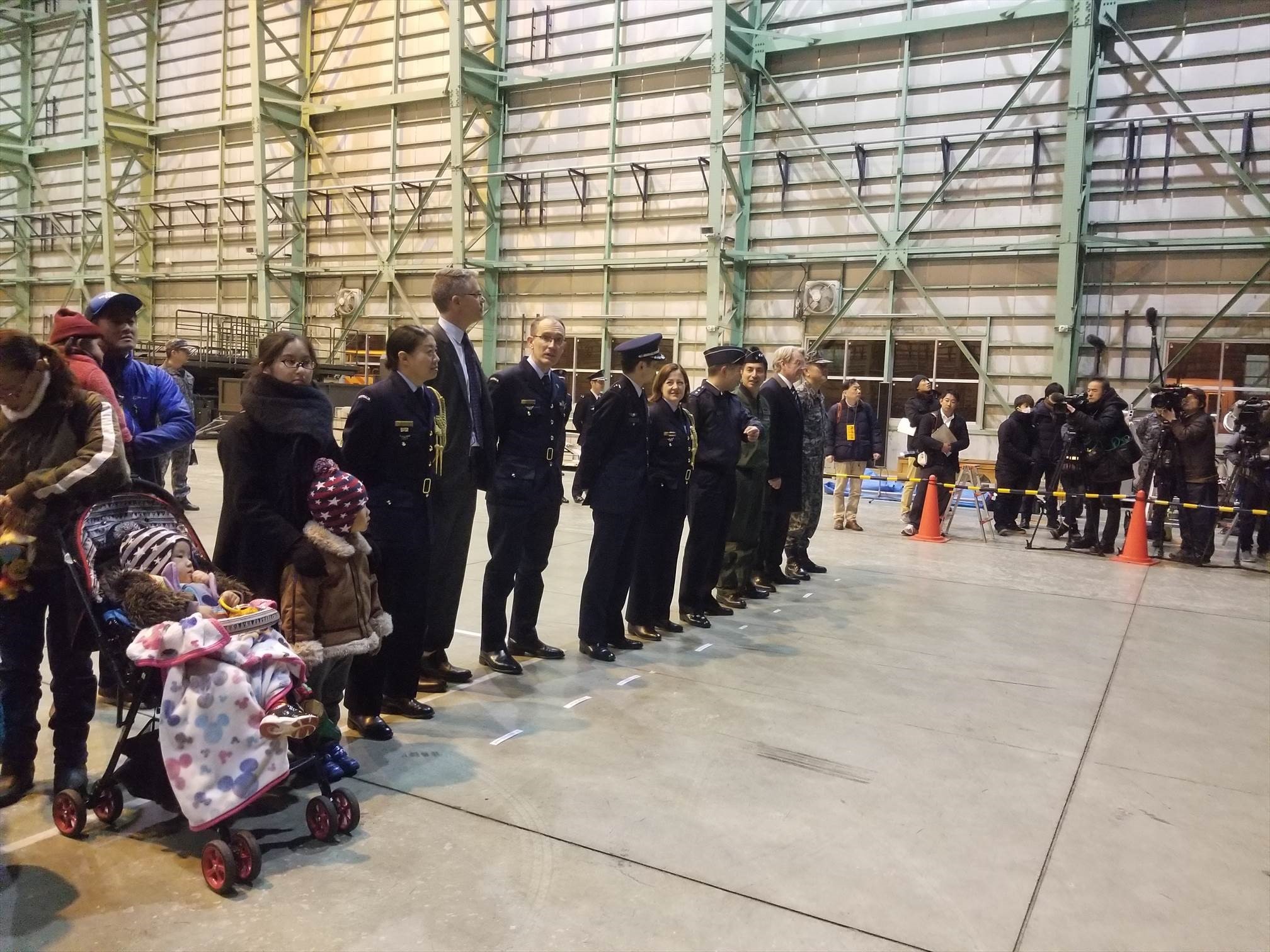 帰国後、千歳基地隊員から歓迎を受ける空輸隊の隊員(統幕SNS