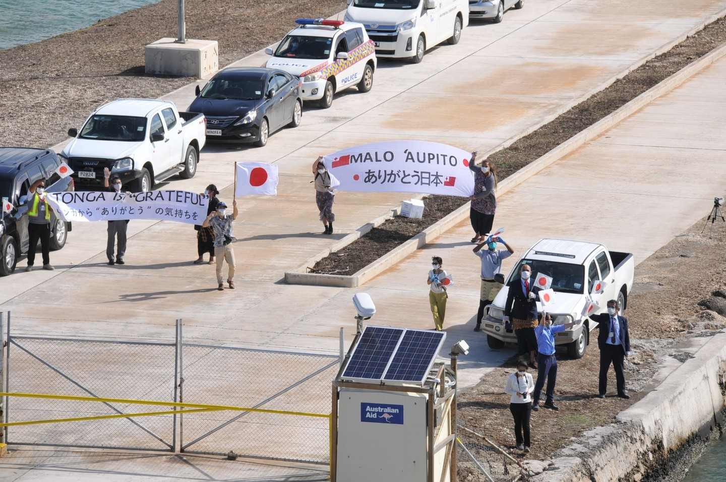 トンガタプ島のヌクアロファ港で「おおすみ」を出迎えるトンガの方々や在留邦人の方々(統幕SNS)
